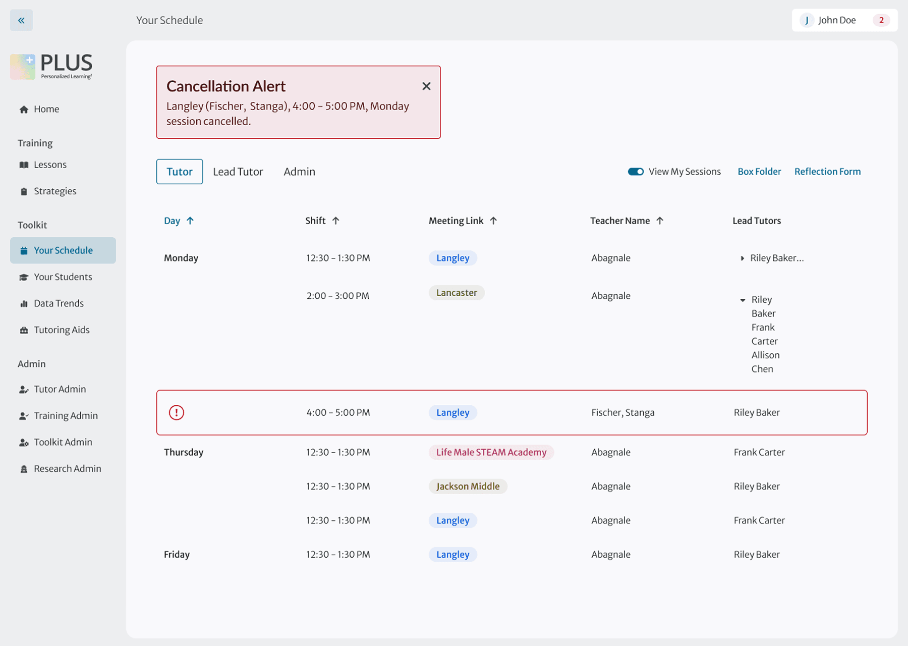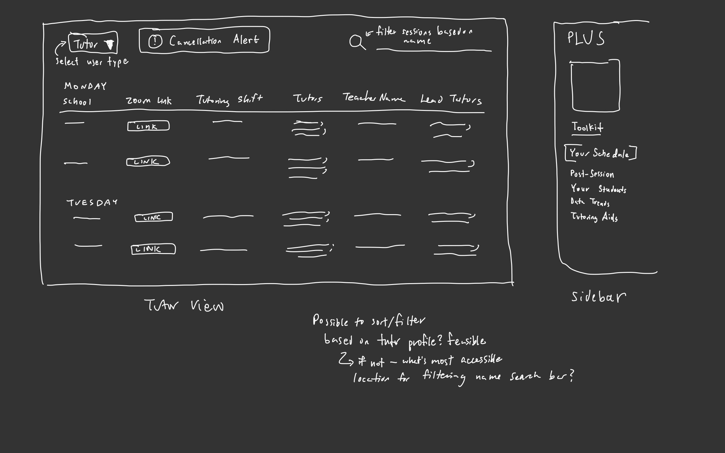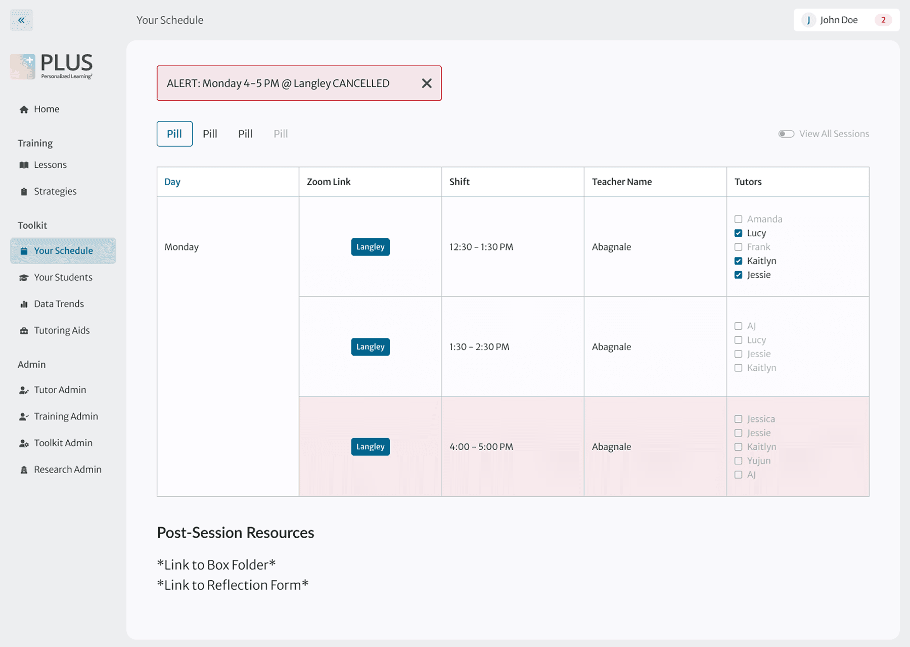 The new schedule streamlines tutor JTBDs through session filtering, real-time cancellation alerts, and optional tutor list cross-checking.