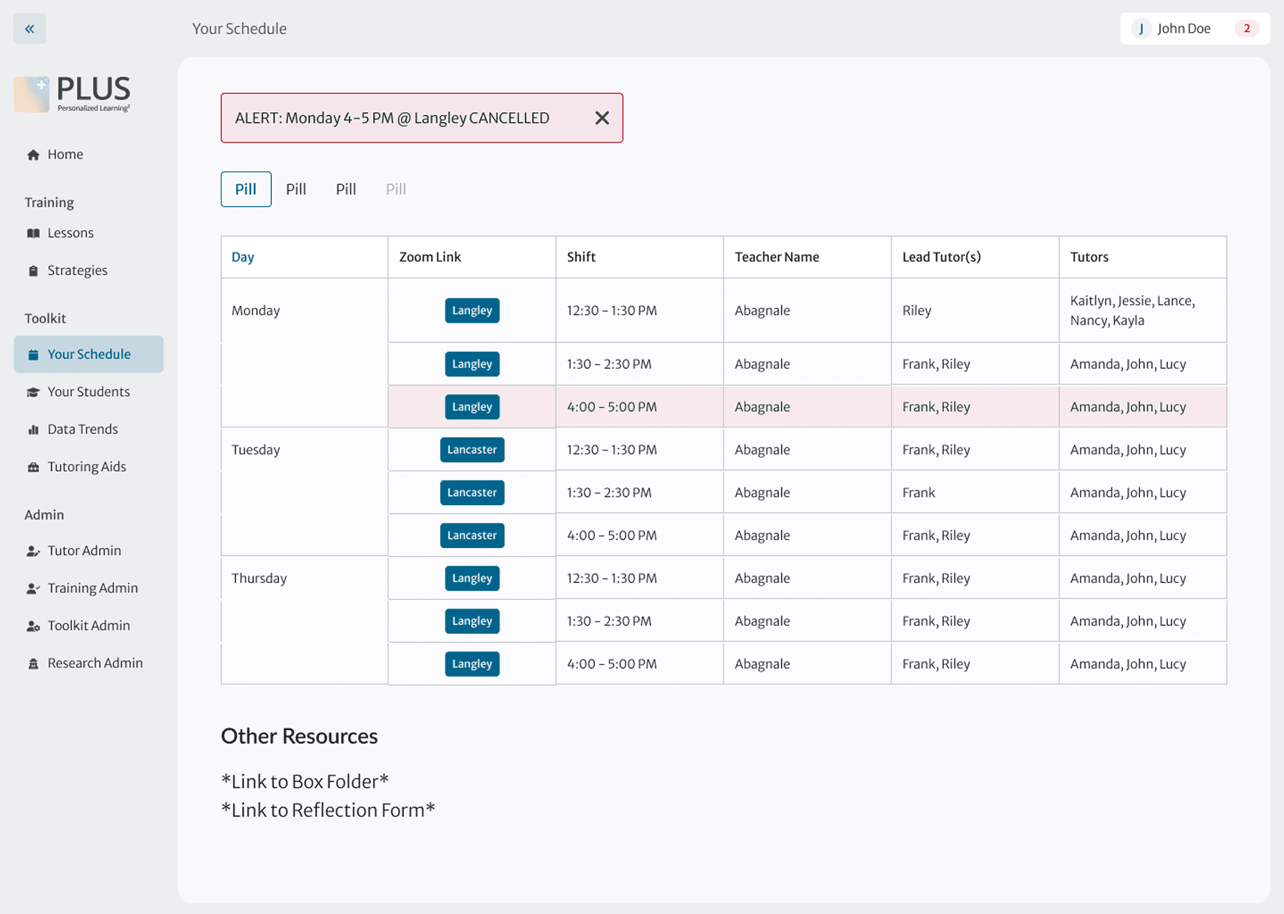 I conducted user interviews to identify regular/lead tutor JTBDs and pain points with the original schedule.