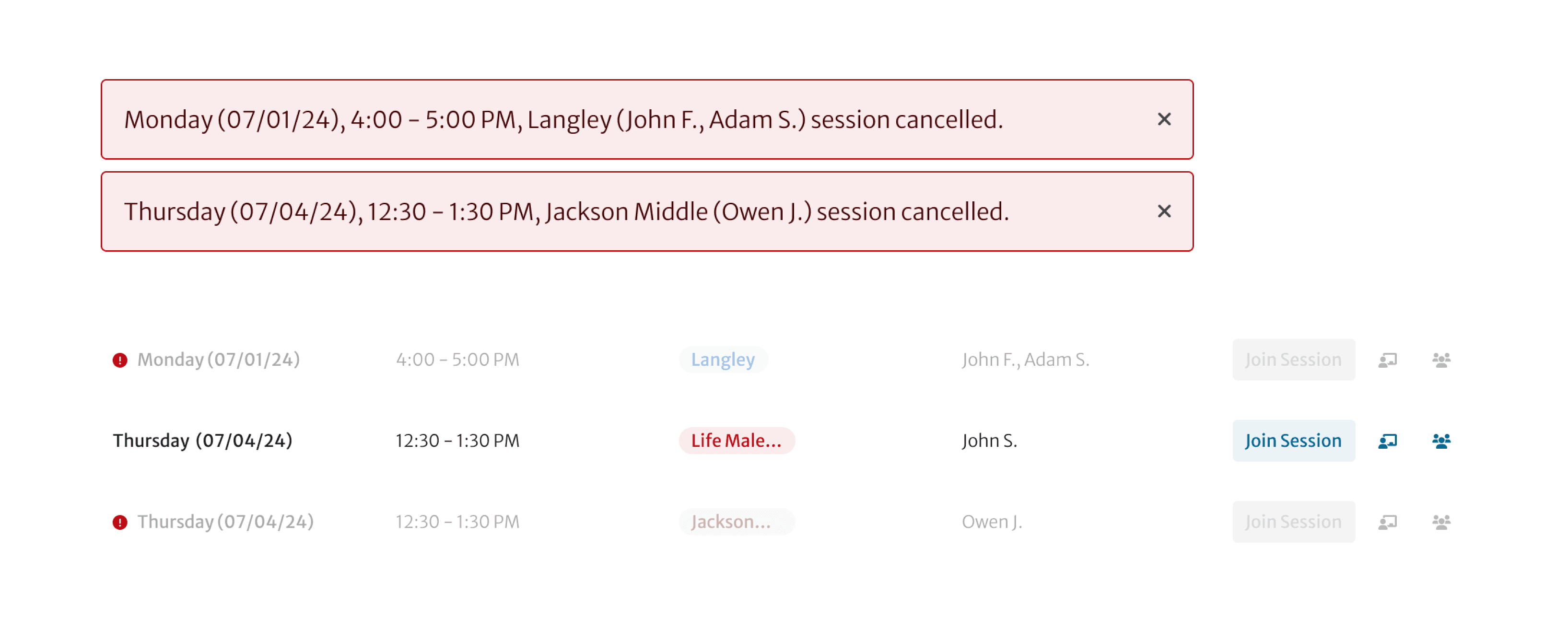 Not only do alerts appear as a dismissible banner, but they're also "disabled" in the table entries to ensure session status is communicated clearly.