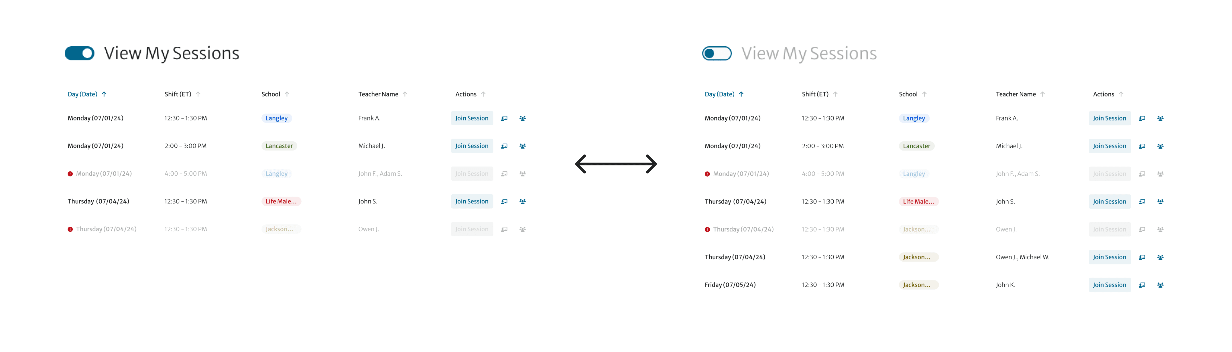Rather than have tutors manually find their names in a huge schedule, I introduced a toggle that filters between the tutors' signed-up sessions vs all sessions.